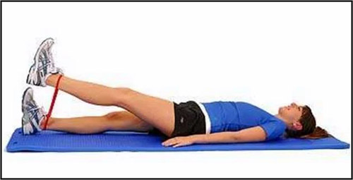 Lie on your back placing the TheraBand around your ankles, lift one leg above the ground keeping the knee straight. Switch legs after sets.