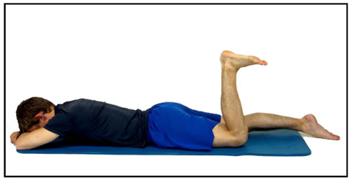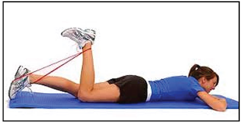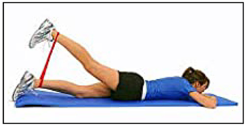 Lie on your tummy placing TheraBand above the knees. Bend one knee keeping it aligned at 90 degrees lift the knee off the ground.