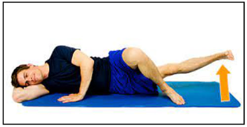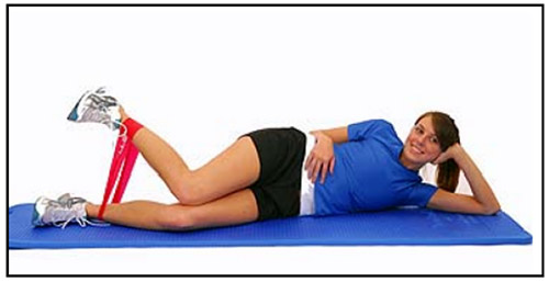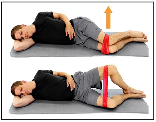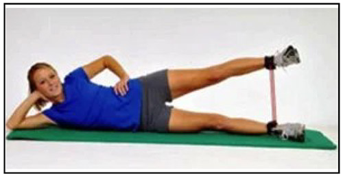 Lie on one side with head resting on your hand and TheraBand above the ankles. Lift the leg above keeping the knees attached as depicted in the image.
